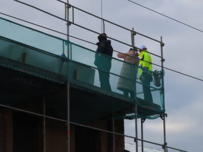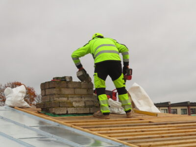 Ehitaja katab parapetti hüdroisolatsiooniga enne pleki paigaldamist. Tapa raudteejaam. Urve, 2025