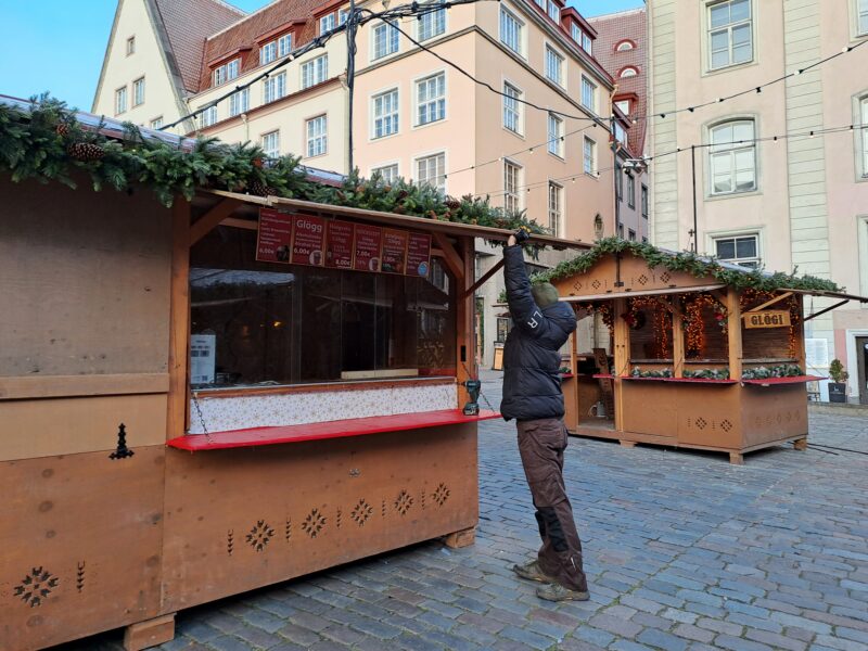 Ettevalmistus jõuluturuks Raekoja platsil.