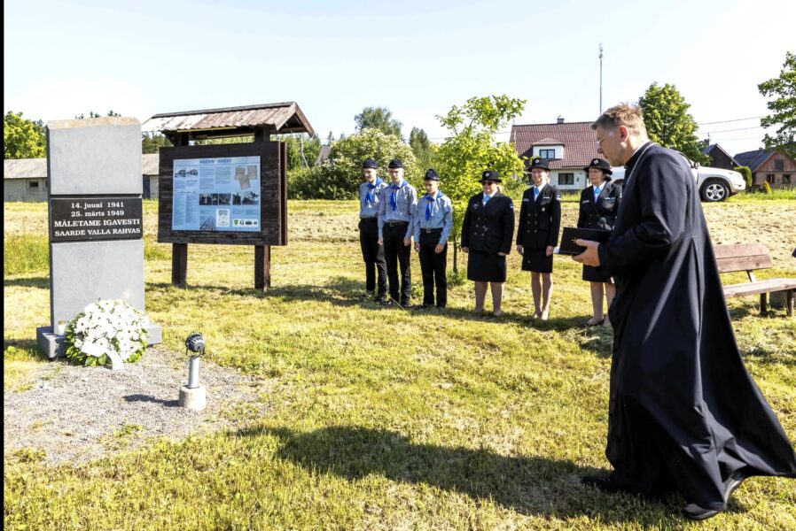 Kilingi-Nõmme raudteejaama lähedale püstitatud mälestuskivi juures toimuvad märtsi- ja juuniküüditamise aastapäeval mälestusüritused. Fotol loeb hingepalve EELK Saarde Katariina koguduse preester Arvet Ollino. Auvalves on Saarde noorkotkad ja naiskodukaitsjad.