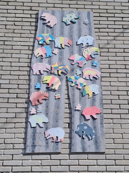 Lihula Lastekunstikooli laste taies “Karupüksid” filmi “Karudemaa” ainetel Lihulas alevimaja seinal. Urve, 2025