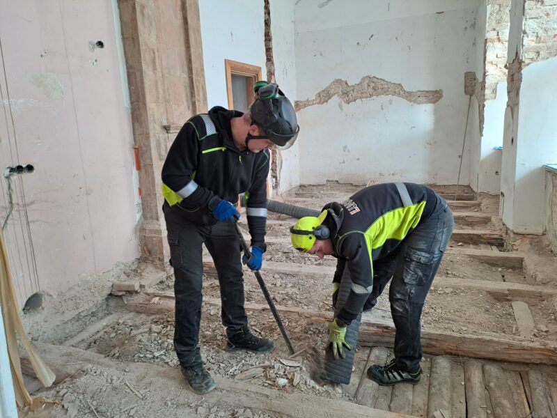 Põrandate talade vahed on vanades majades täidetud heliisolatsiooni saavutamiseks. Mida raskem täide, seda parem heliisolatsioon. Seeneuuringute teostamiseks telliti uurijate soovil põrandatest 2. korrusel täite eemaldamine. Täite eemaldamiseks telliti suure imemisvõimsusega prahiimemisauto. Üks mees lükkab kangiga lahti paakunud täidet ja teine mees juhib imemistorru. Peale proovide võtmist tuleb seenest kahjustunud puitkonstruktsioonid välja vahetada või plommida. Peale nende tööde tegemist täidetakse põrandad uue täitega.