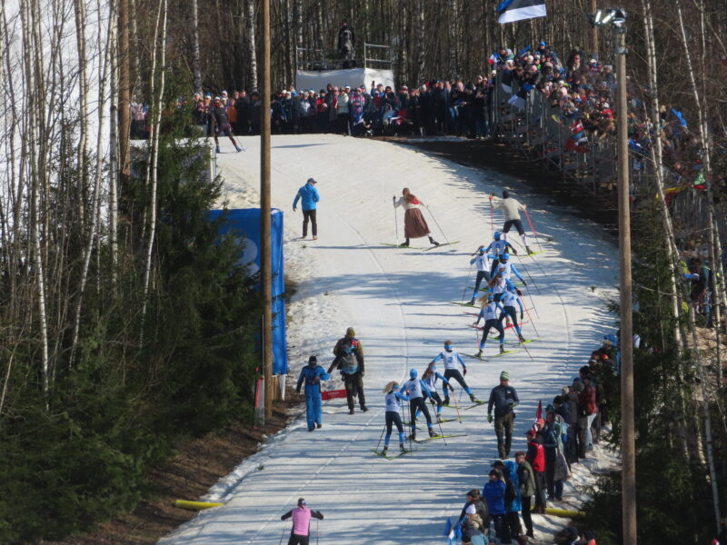 Laskesuusatamise soojendussõidu juurde kuulusid sõitjad seelikus ja kampsunis.