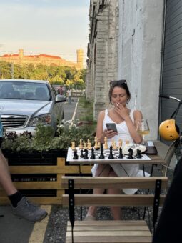 Sõbranna Laura Bachmann suvisel Telliskivi terrassil. Andres, 2025