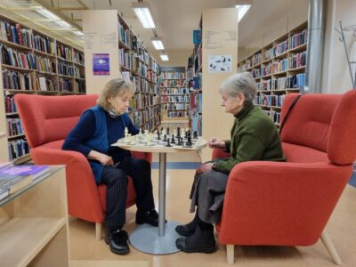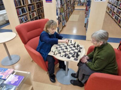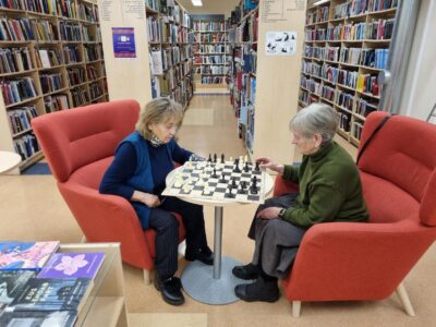 Veteranmaletajad Liida (85a) ja Tiiu (81a) iganädalast malet mängimas Kännukuke raamatukogus. Jaan, 2026