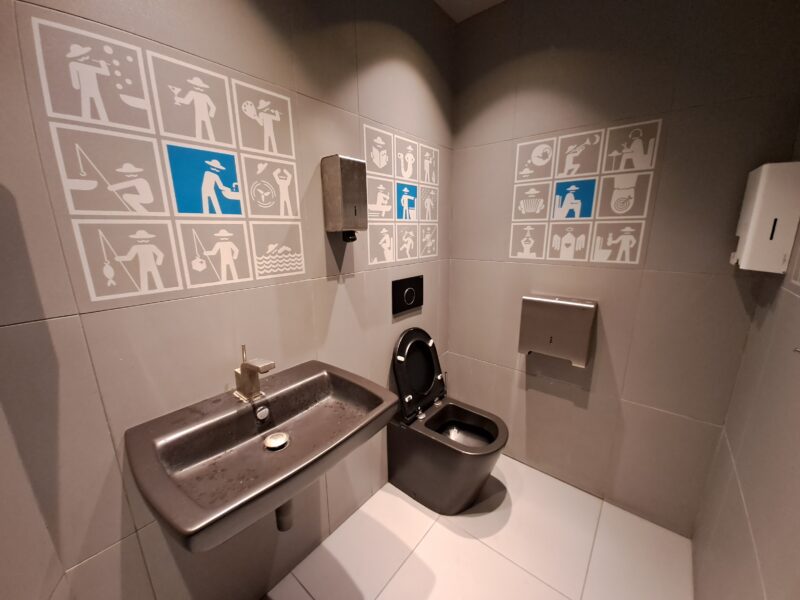 Tarbekunsti- ja disanimuuseumi WC kujundus teeb panuse disainile embleemide näol seinal.